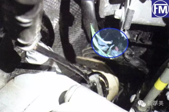 其次通过诊断仪观察换挡杆的挡位实际值,结果正常,这就排除换挡杆开关。接下来就把间题的重点放在CAN线上与智能伺服模块上。于是测量CAN线,测量低位CAN的时候电压在2.3V,在正常范围内。测量高位CAN的时候发现没有电压,这就不正常了,正常情况下应该有2.7V左右的电压。于是使用CAN-C分配器测量1号针脚到智能伺服模块上的2号针脚之间是否断路,用万用表测量两者之间不通,说明存在断路。接下来的重点就是找出断路的地方。顺着线查看,发现在发电机上方线路存在异常,拨开线皮找到断路的地方见下图。